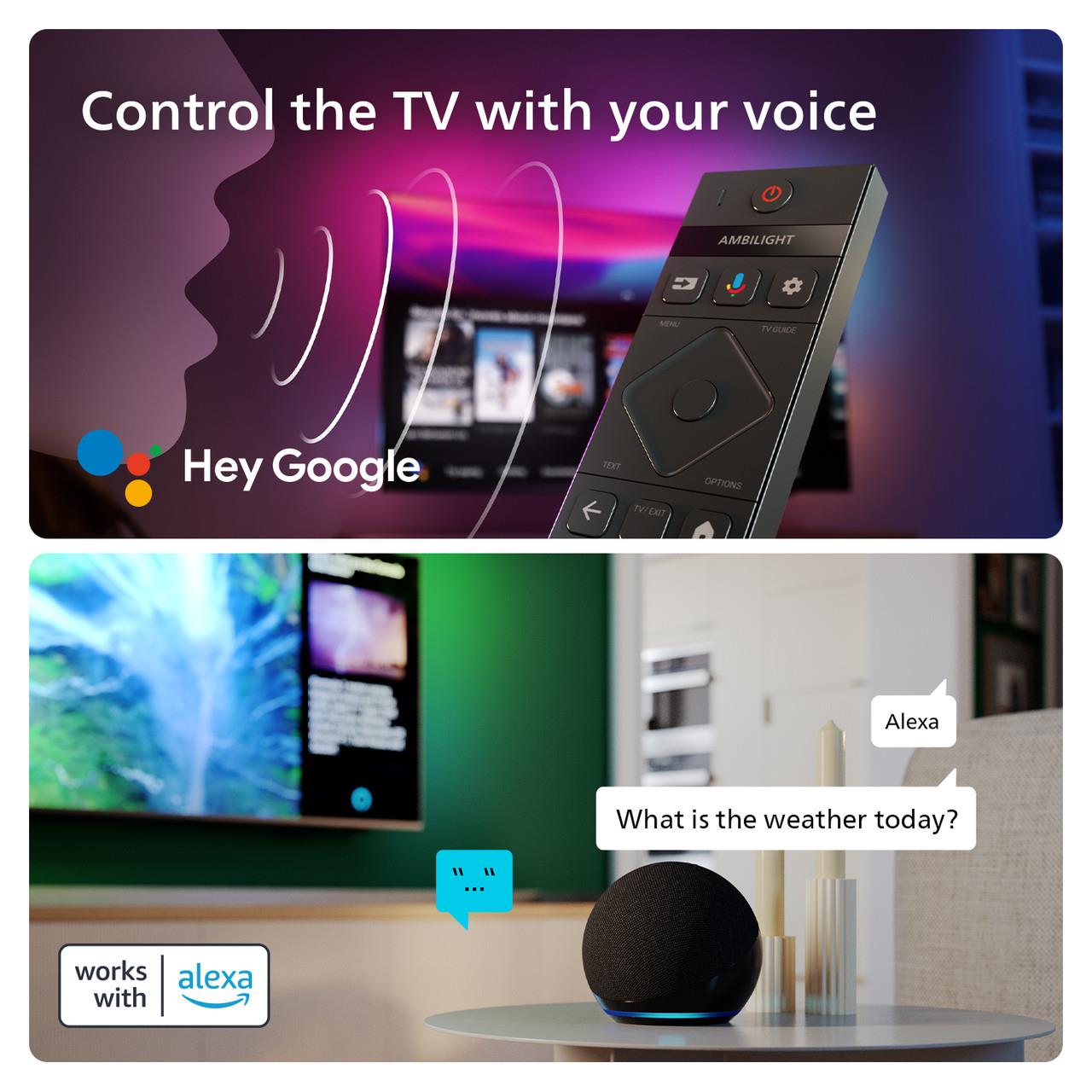 Working via the built-in Google TV system, Google Assistant helps you find content, apps and even controls compatible smart home devices, such as the Philips Hue lighting system. All this is available by simple voice command. Alternatively, connect your Amazon Echo or similar Alexa device and use voice commands via Alexa (Works with Alexa).